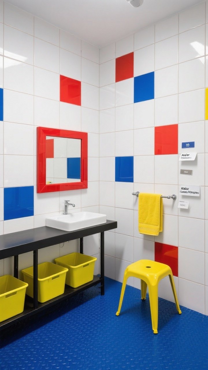 Une salle de bain énergique et très graphique. Au mur, carreaux blancs 10×10 avec quelques insertions aléatoires rouge, bleu, jaune comme une composition à la Mondrian. Sol en caoutchouc bleu moyen, confortable et antidérapant.