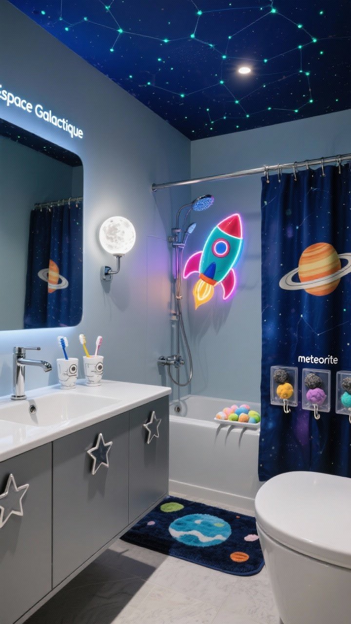 Place à l’imaginaire! Plafond peint en bleu nuit avec micro points phosphorescents façon constellation, murs gris perle pour équilibrer, et tapis de bain planète Saturne. Le rideau de douche affiche une grande fusée colorée prête à décoller.