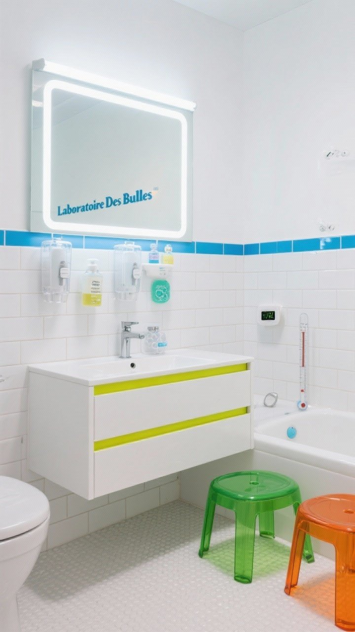 Le meuble vasque laqué blanc a des tiroirs avec liserés néon (jaune, vert, orange) pour identifier le rangement de chaque enfant. Au-dessus, un miroir large avec éclairage LED intégré, pour un effet laboratoire propre et ludique.