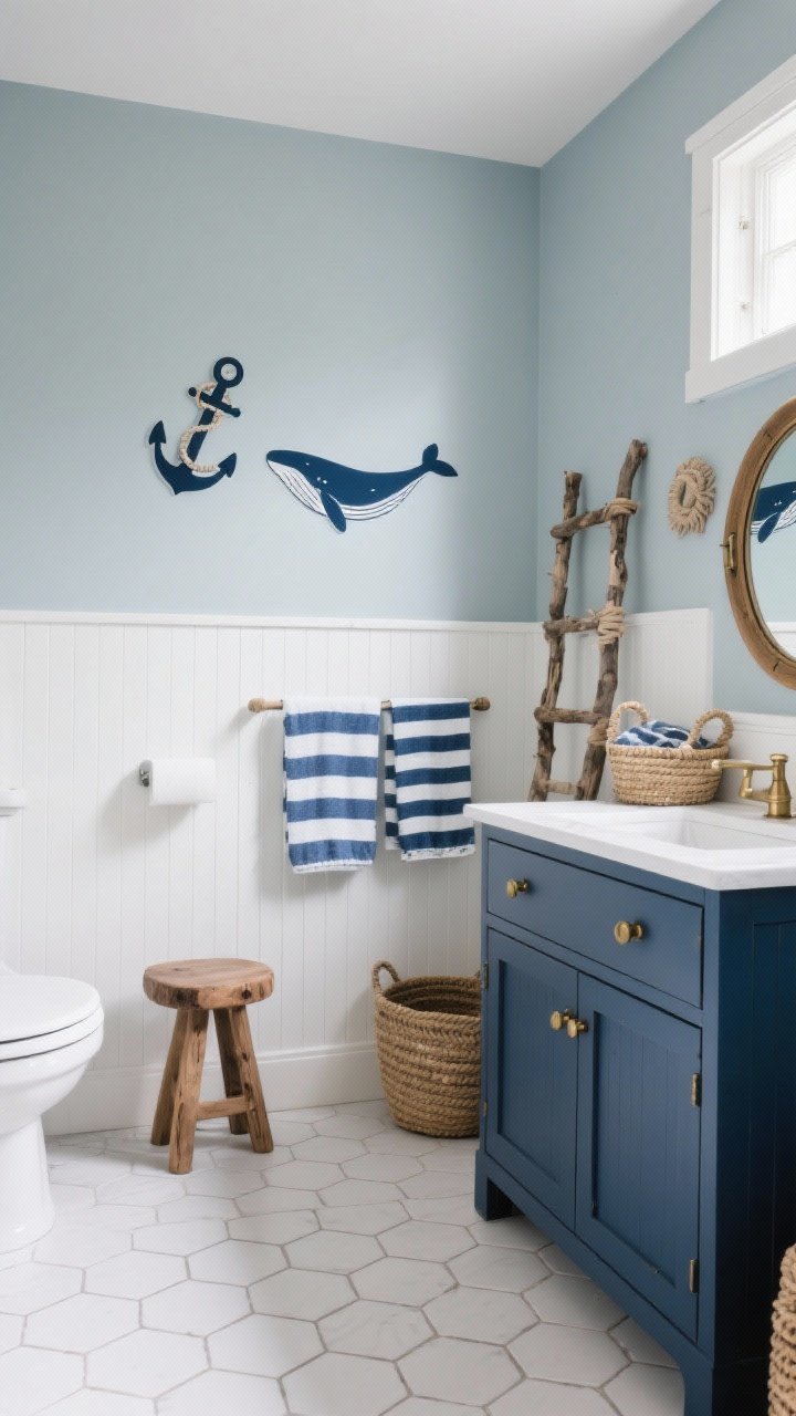 Le meuble vasque bleu marine, à poignées laiton, apporte la profondeur. Ajoutez un miroir hublot, des paniers en corde et un tabouret en bois brut pour une vibe cabane de pêcheur.