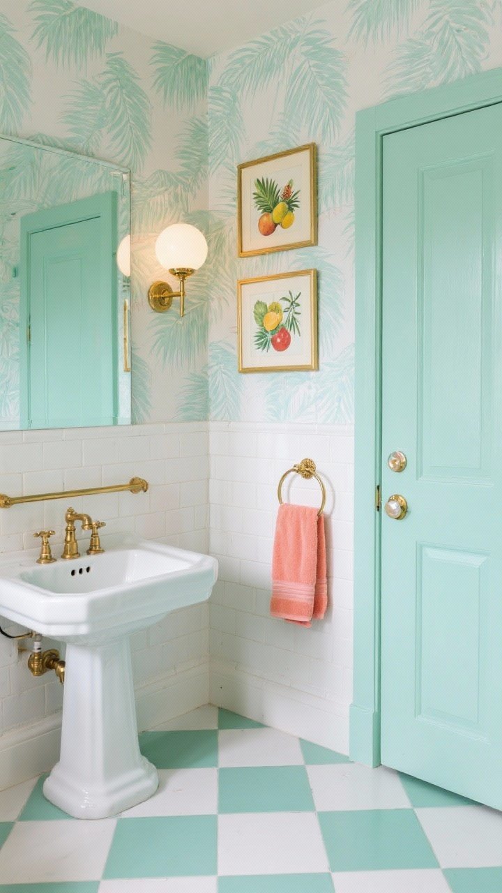 Un clin d’œil aux hôtels vintage des Caraïbes. On ose une palette menthe, corail et laiton avec des motifs classiques. Les murs se parent de papier peint palmes dans des tons doux, équilibré par un carrelage métro blanc.