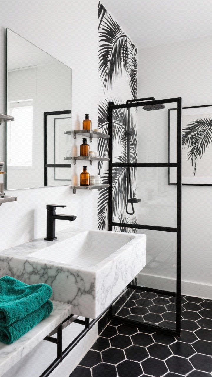 Si vous aimez le contraste net, celui-ci est pour vous. Base blanche lumineuse, accentués de noir graphique et de touches végétales vives. Un papier peint palmes noir et blanc recouvre un pan, le reste reste lisse et clair.
