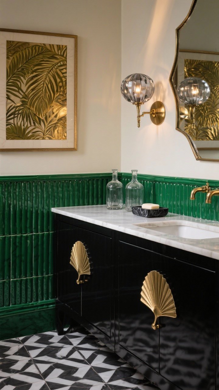 Le sol présente un motif géométrique en éventail noir et blanc, rappelant l’Art Déco. Double vasque intégrée dans un meuble laqué noir, poignées en éventail laiton, et miroir à facettes.