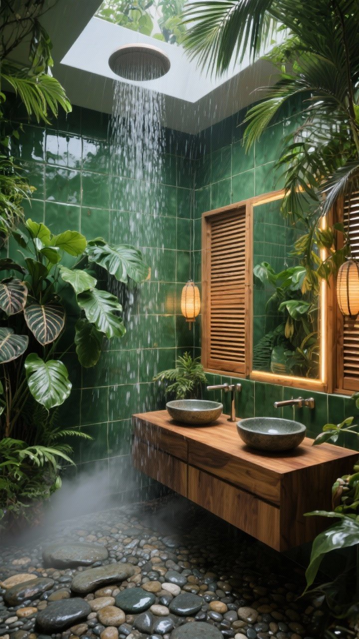 Ici, on joue l’immersion totale. Murs recouverts de carreaux vert bouteille brillants façon zellige, qui captent l’eau et la lumière. Une pluie tropicale tombe d’un large ciel de douche, entourée de plantes épaisses.