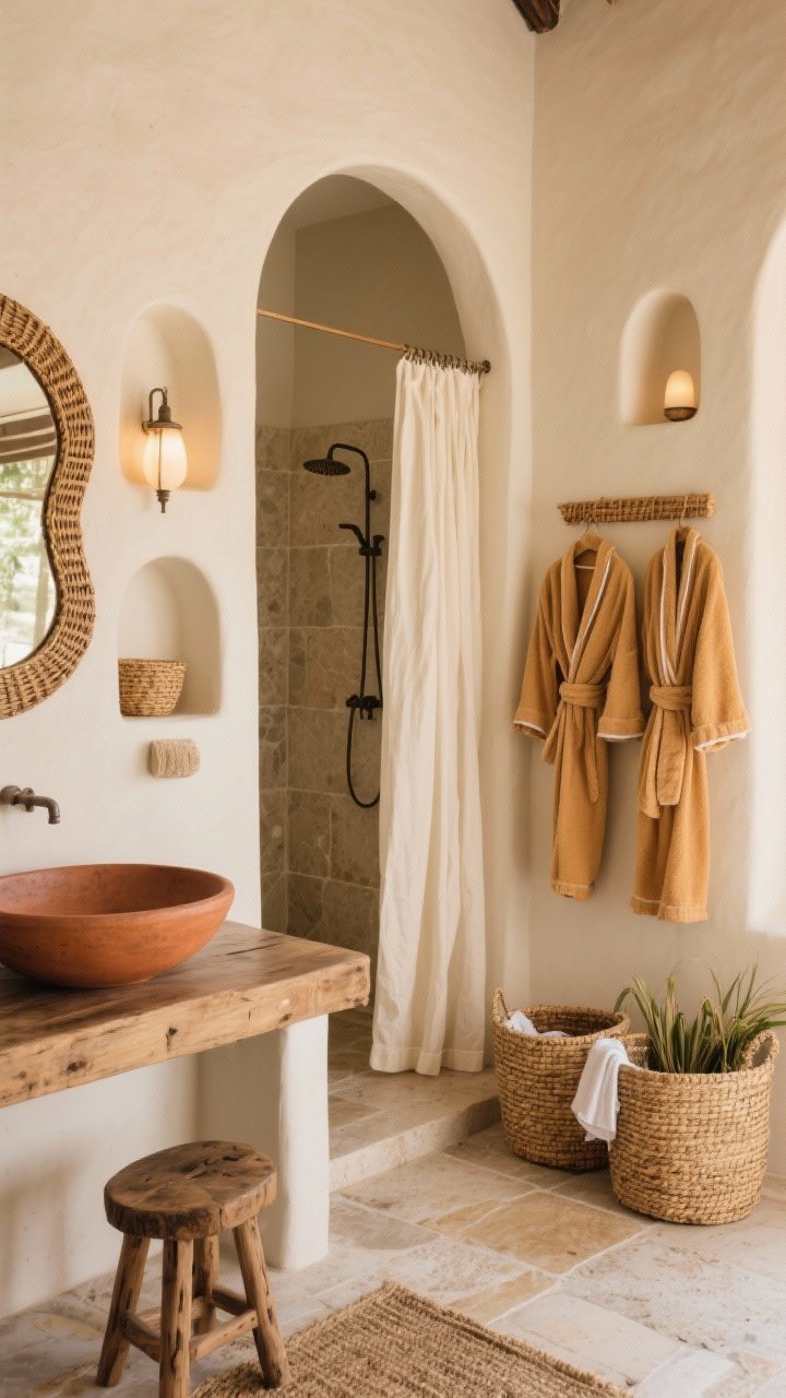 Une ambiance villa balinaise, doucement rustique. On mise sur le rotin, le teck vieilli et des tons terre. Les murs crème sont ponctués de niches arrondies, et une arche mène à la douche.