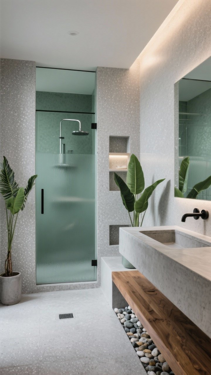 La vasque posée en béton lissé rencontre une robinetterie noir mat, et deux grandes plantes au feuillage architectural encadrent l’espace. Lumière douce et indirecte, presque thérapeutique.