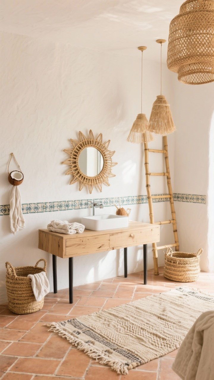Le meuble vasque en bois brut repose sur des piètements fins noirs, et le miroir en rotin soleil devient la pièce signature. Au sol, du carrelage terracotta clair posé en chevrons pour un effet fait main.