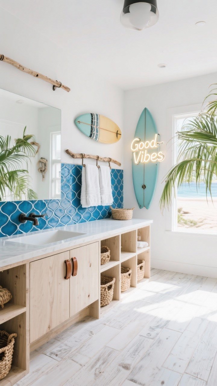 Esprit cabane de plage énergique. On mixe bois clair, bleu océan et blanc lumineux. Le mur de la vasque reçoit un carrelage bleu profond en écailles de poisson, clin d’œil aux vagues.