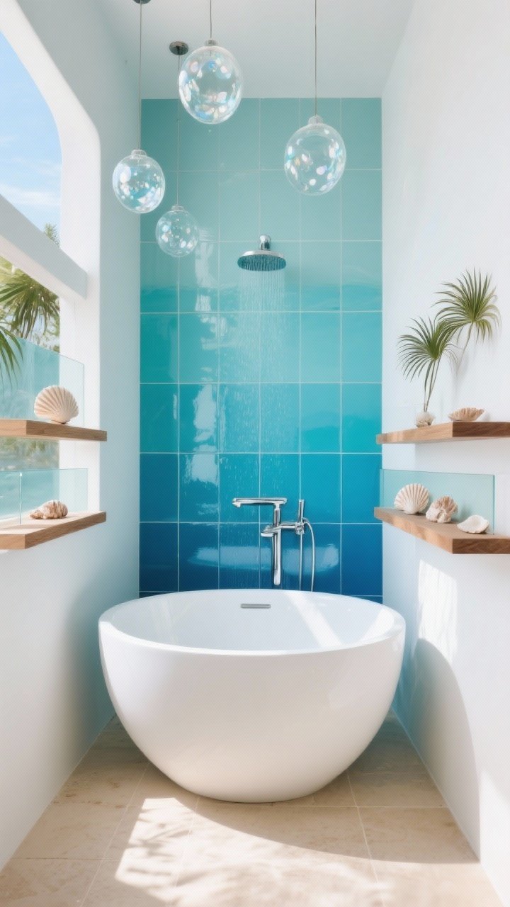 Une baignoire îlot ovoïde occupe le centre, posée sur un sol en grès cérame sable. Robinetterie chrome brillante qui reflète les bleus, et étagères en chêne flottantes pour les coquillages et savons.