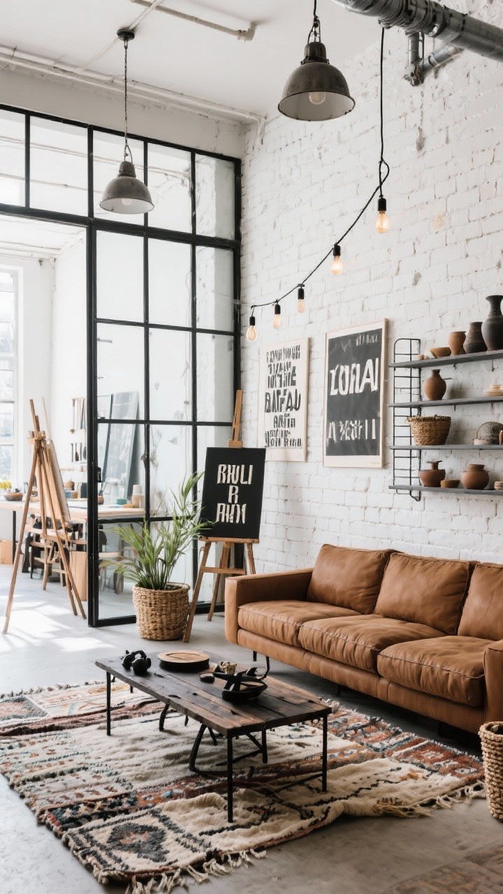 Imaginez un loft lumineux. Les murs en brique blanchie et la verrière noire contrastent avec des tissus souples et des tapis superposés.