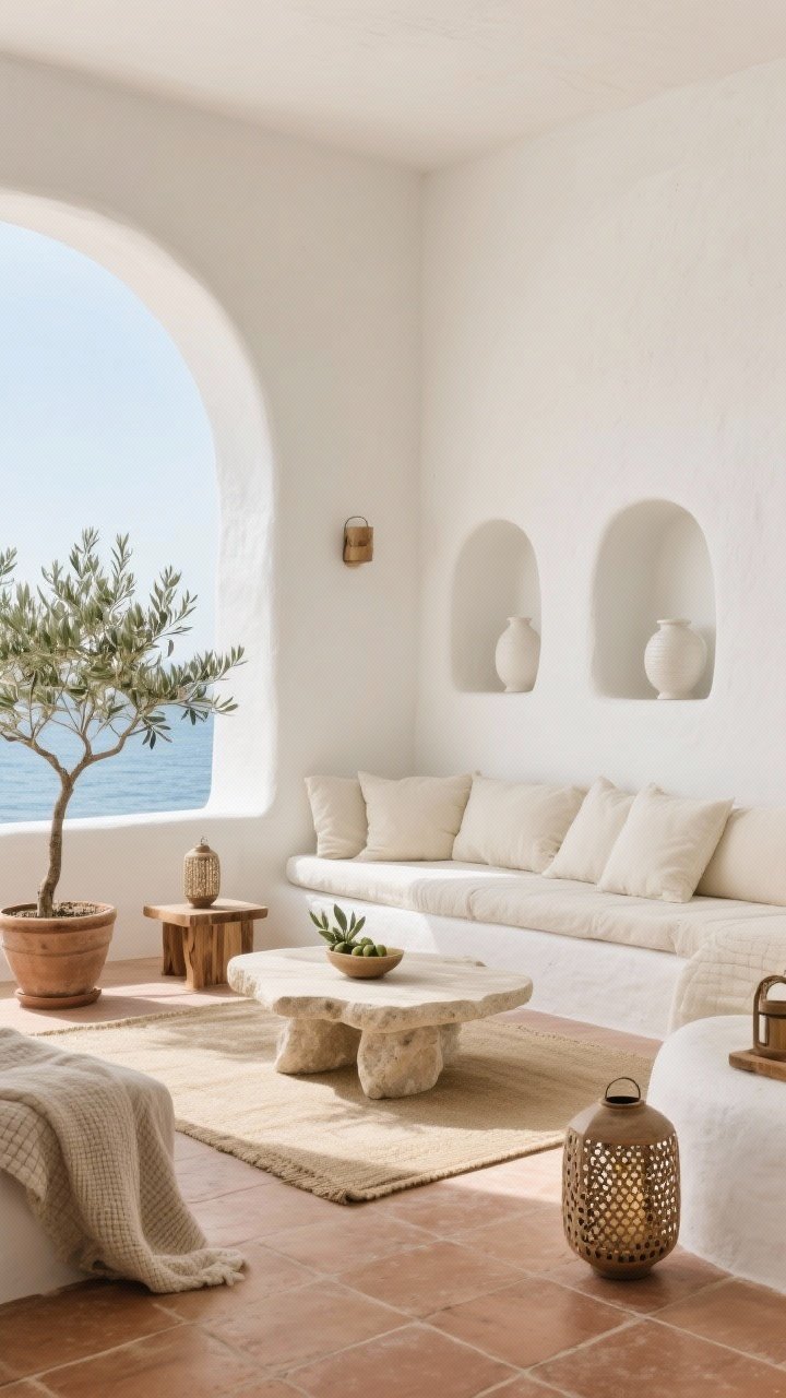 Un canapé banquette maçonné, assises en coussins écrus, s’accompagne d’une table basse en pierre aux bords organiques. Le sol en tomettes ou en microciment sable ancre l’ambiance.