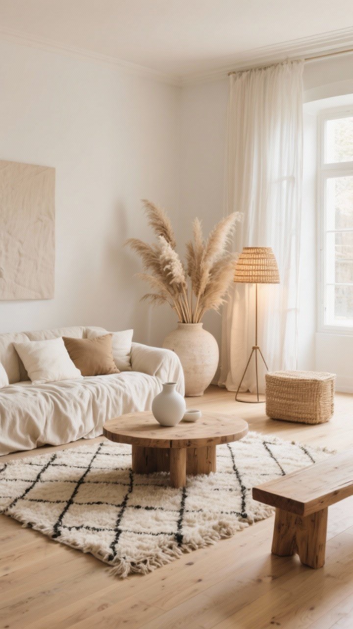 Le sol en chêne blond accueille un grand tapis berbère à losanges, légèrement duveteux. Une table basse ronde en bois brut et un banc en chêne massif servent de scène pour des vases en céramique blanche.