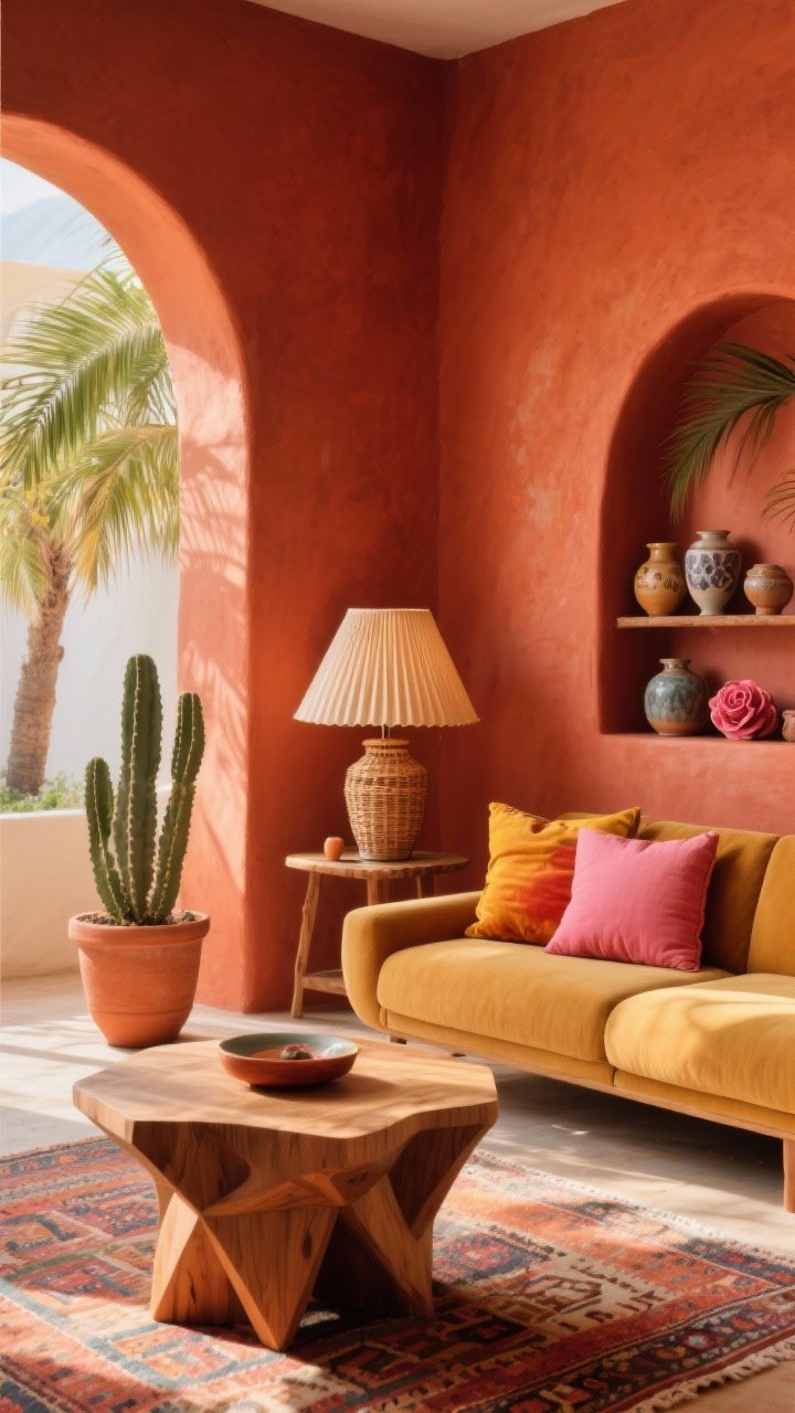 Place aux couleurs vibrantes mais chic. Le mur accent se pare d’un terracotta profond, réchauffé par un canapé couleur miel.