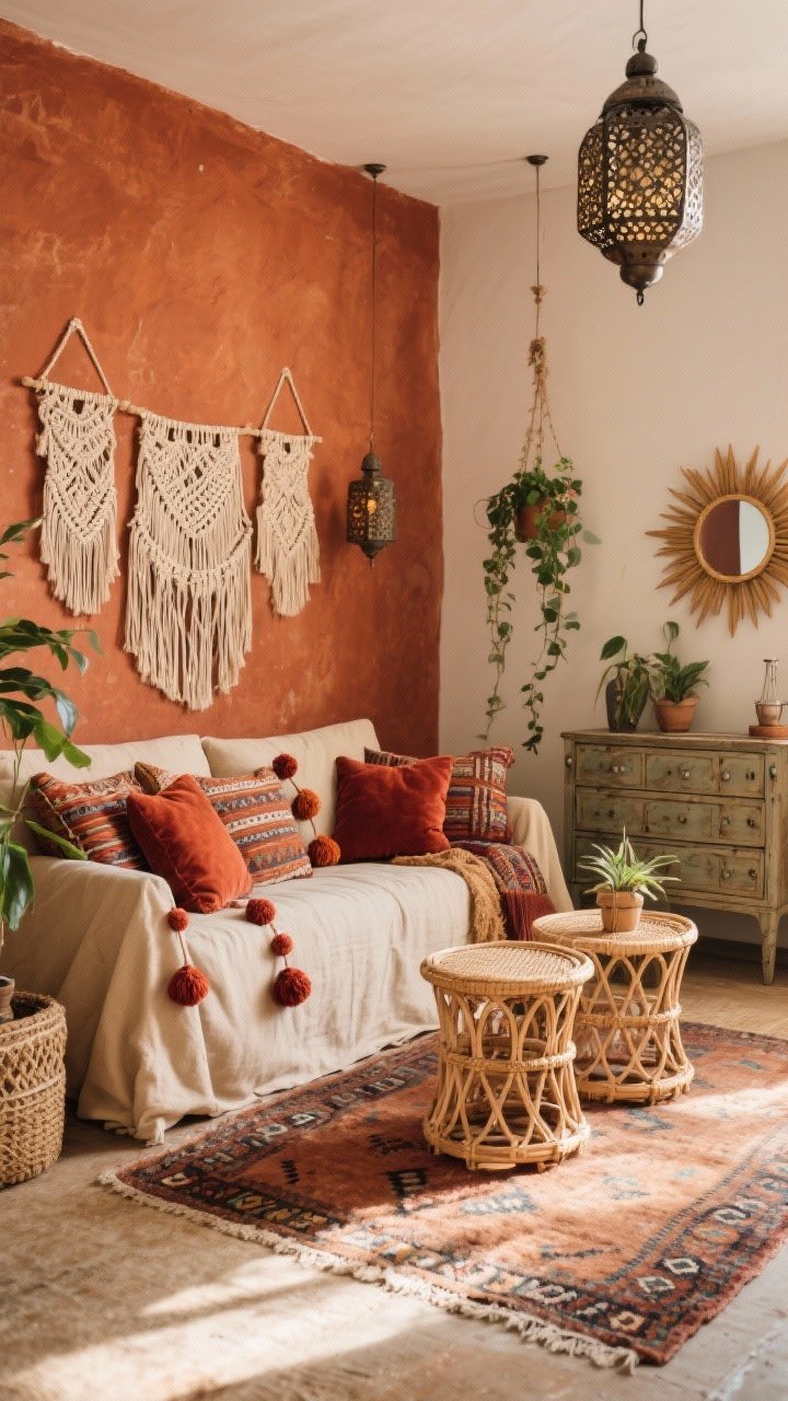 On part sur une vibe voyageuse, cosy et artistique. Un mur terracotta sert de fond au canapé en lin sable garni de coussins en kilim, velours rouille et pompons.