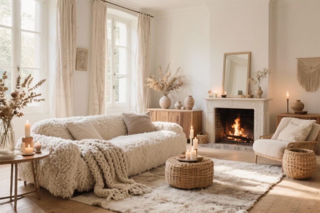 On réchauffe le tout avec un tapis laine berbère, une table basse en bois massif aux bords irréguliers, et des lampes en lin à lumière ambrée. Une fausse peau de mouton jetée sur un fauteuil scandinave, et c’est l’hiver bien vécu.