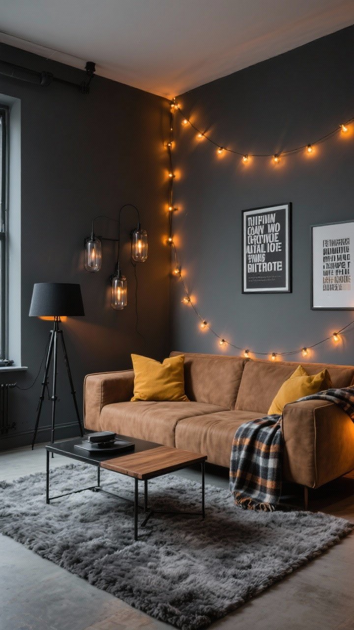 La lumière fait tout: guirlandes LED ambrées, lampadaire trépied noir, et des appliques à verre fumé. Au sol, un tapis à poils longs gris chiné, et une table basse métal noir + bois pour le contraste.