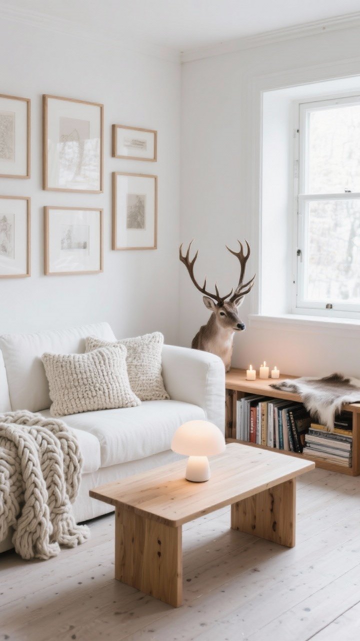 Le cœur du look, c’est l’équilibre: table basse en chêne, lampe champignon opaline, plaid en tricot XXL. Ajoute un banc bas sous la fenêtre avec des livres alignés et une peau de renne pour la touche nordique.