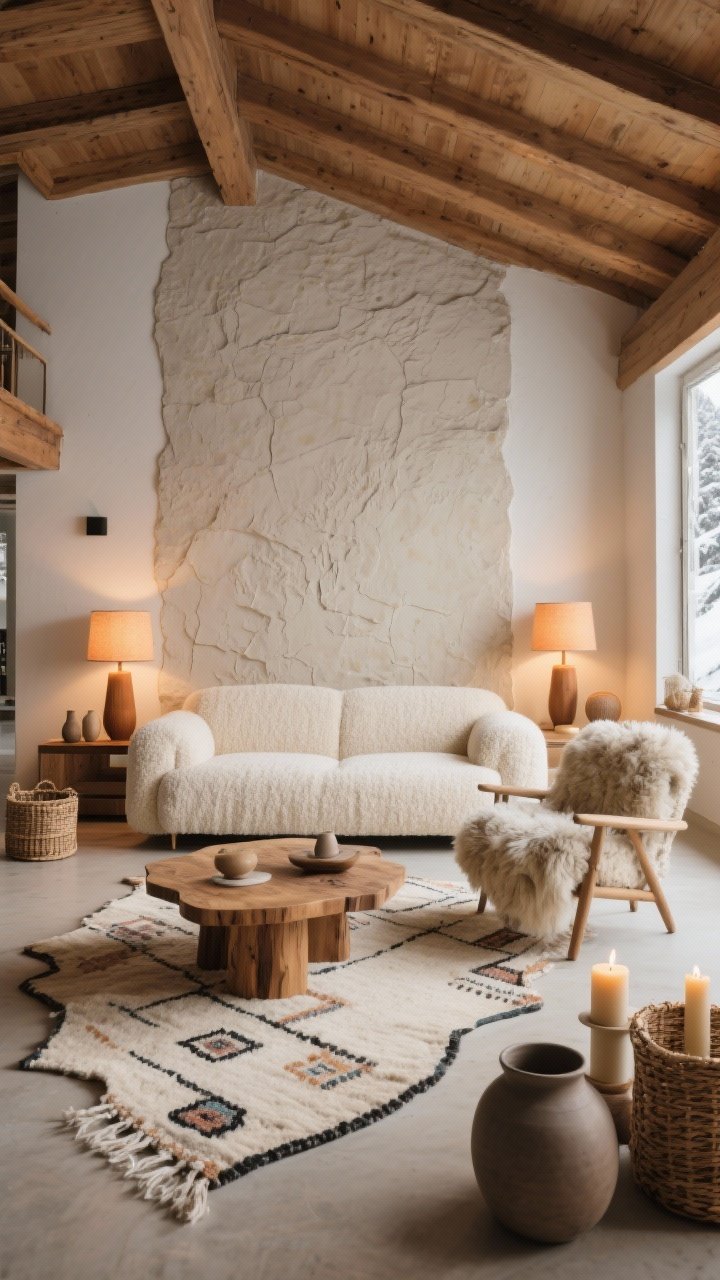 Imagine un salon baigné de beige, taupe et écru, comme un chalet luxueux sans lourdeur. Sur un mur, un enduit minéral texturé, face à un canapé XL en bouclette crème qui donne envie de s’y plonger.