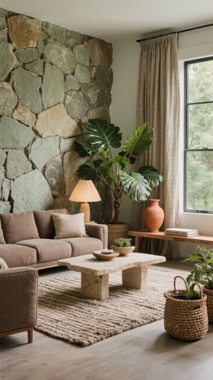 Un salon inspiré par la nature, mais traité comme un spa chic. Un mur en pierre apparente (ou parement), des rideaux en lin lourd couleur chanvre, et un canapé modulable taupe.