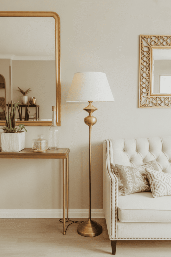 Envie d’une note de luxe ? Les finitions métalliques sont vos meilleures alliées. Le laiton brossé, l’or ou l’argent se marient divinement bien avec les tons sable. Que ce soit via un miroir, un luminaire ou de petits objets déco, ces éclats métalliques captent la lumière et insufflent une dose de glamour subtil à votre salon.