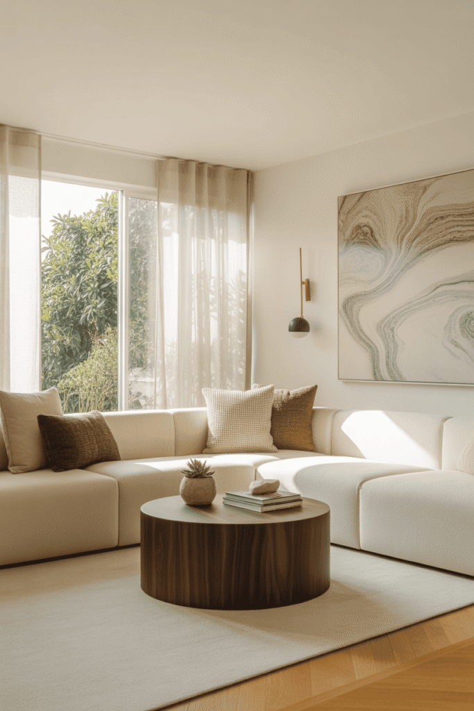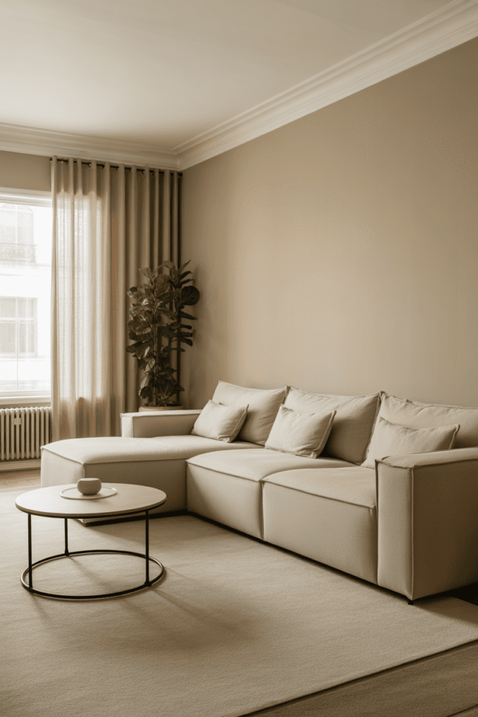 L’erreur serait de se limiter à un beige plat et uniforme. Pour donner vie à votre pièce, maîtrisez l’art du camaïeu. N’hésitez pas à mélanger les tons : crème, sable, taupe, coquille d’œuf… Appliquez ces variations sur les murs, le mobilier et les textiles. Cette superposition crée une profondeur visuelle immédiate et transforme l’espace en un lieu riche et multidimensionnel, loin de toute monotonie.