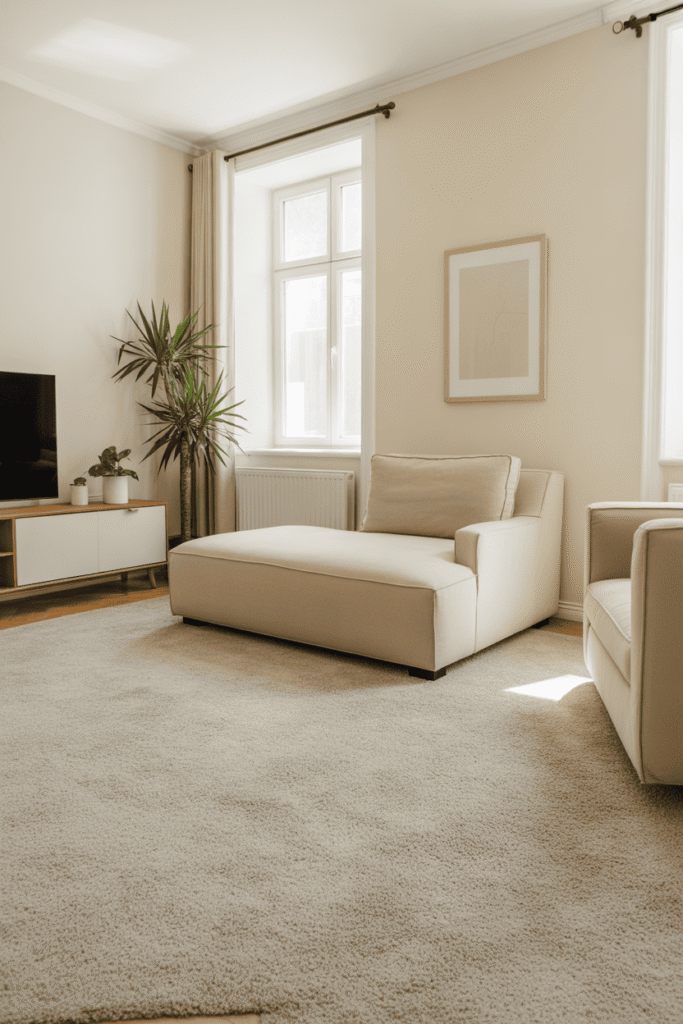 Le tapis est l’élément qui ancre le salon. Optez pour un modèle beige, mais riche en texture : motifs en relief, tissage berbère ou effet « shaggy ». Il délimite la zone de confort, réchauffe le sol et lie tous les éléments de la décoration entre eux sans surcharger visuellement l’espace. C’est la touche finale pour une ambiance feutrée.