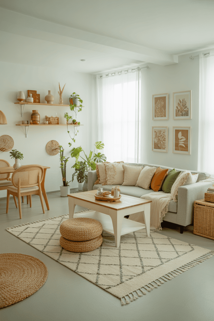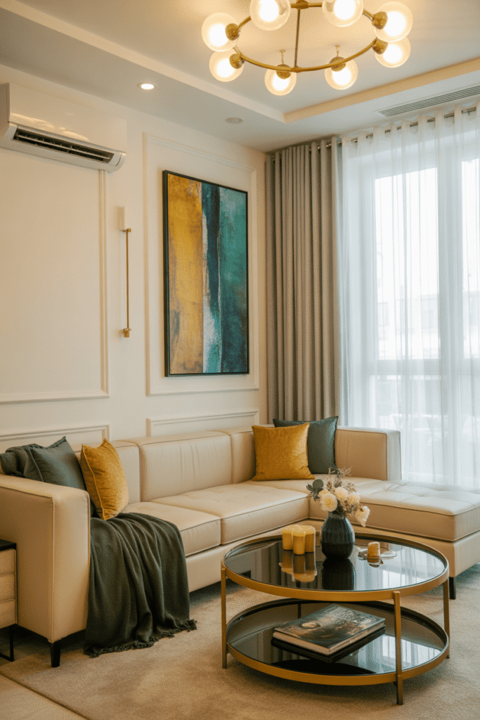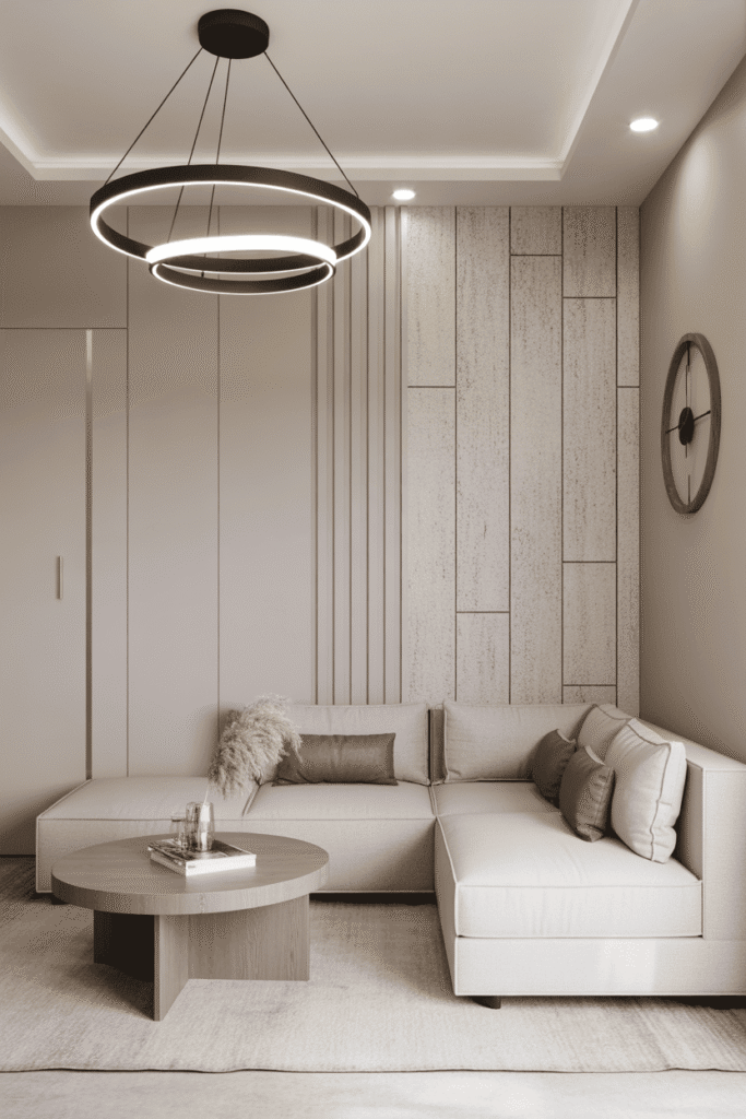 La preuve que petit rime avec joli. Les tons neutres agrandissent visuellement l’espace. Le canapé beige, surélevé, apporte de la légèreté, accompagné de coussins fins. La table basse ronde facilite la circulation tout en restant fonctionnelle. Une plante verte vient combler un coin vide avec fraîcheur, finalisant ce décor naturel.