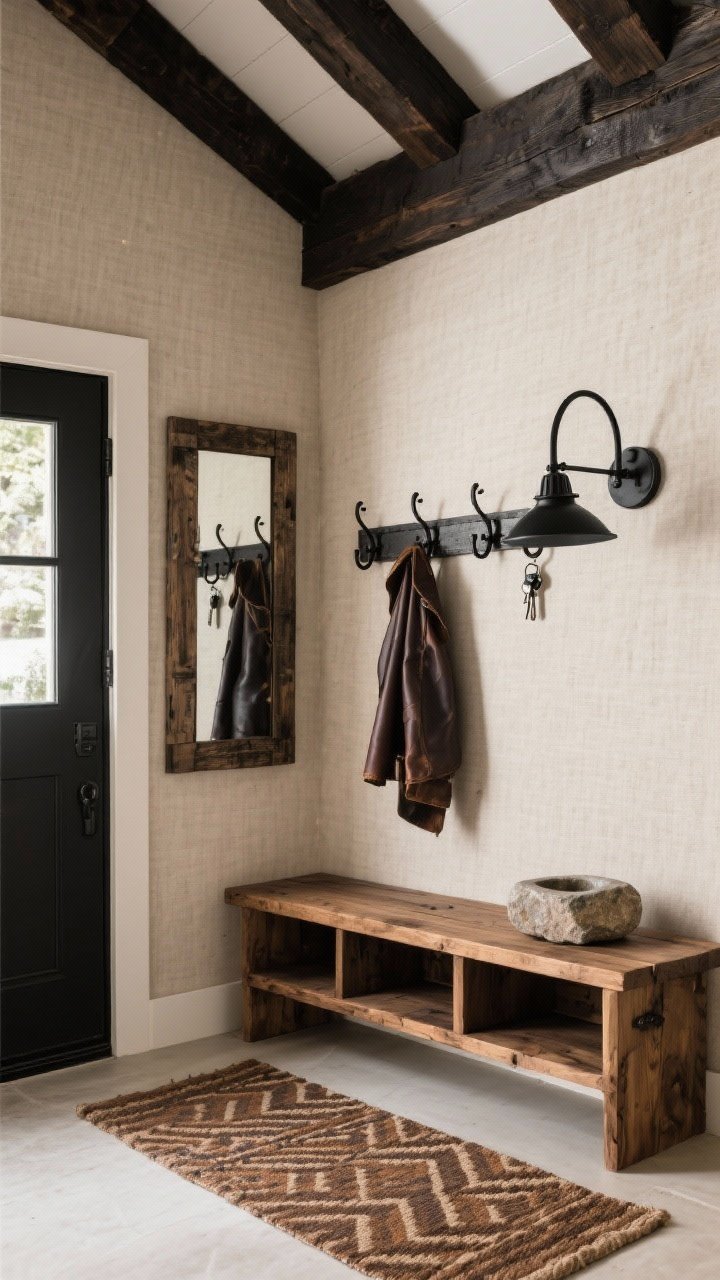 Mariage du brut et du soigné. Poutres apparentes (ou fausses poutres) en bois foncé, murs lin naturel, et un banc en bois massif avec rangement dessous. Un portemanteau fer forgé ajoute la note artisanale.