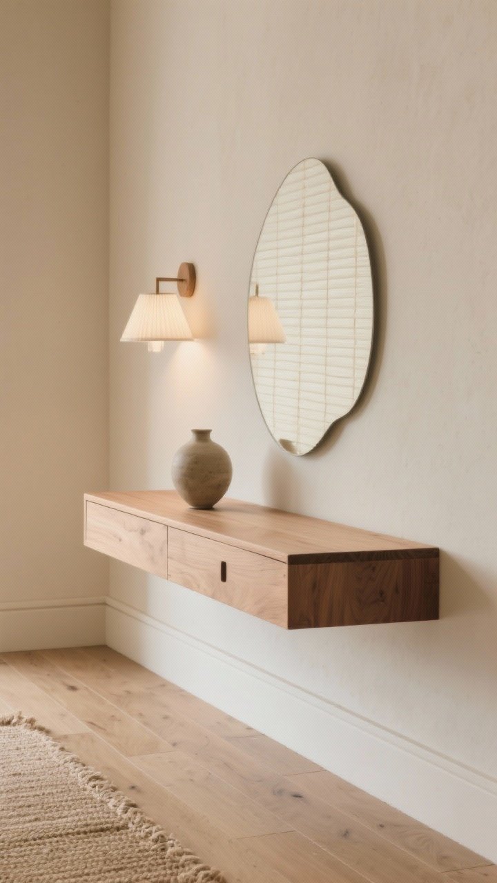 Place au calme visuel. Murs beige sable, plinthes fines, et un sol en chêne clair à larges lames. Une console flottante en bois lisse, sans poignées, paraît presque suspendue.
