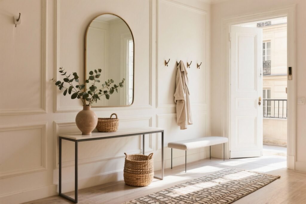 Un banc capitonné gris perle glisse sous des patères minimalistes. Ajoute une lampe bouillotte noire sur la console, un vase avec des branches de magnolia, et un plateau vide-poches en marbre. C’est net, élégant, et super photogénique.