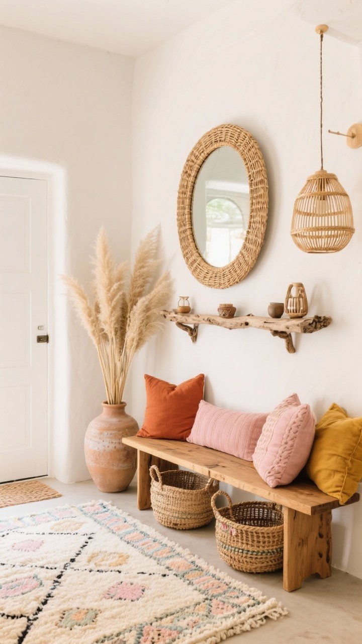 Une entrée qui sourit. Murs blanc chaud, miroir en rotin oversize, et une étagère murale en bois flotté pour les petits objets. Au sol, superpose un tapis berbère crème et un petit kilim pastel pour la touche bohème.