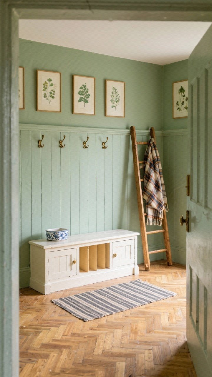 Le cocon parfait. Murs vert sauge mat avec soubassement à l’anglaise, crochets en laiton vieilli, et un banc coffre en bois peint crème. Au sol, un parquet miel posé en chevrons adoucit tout.