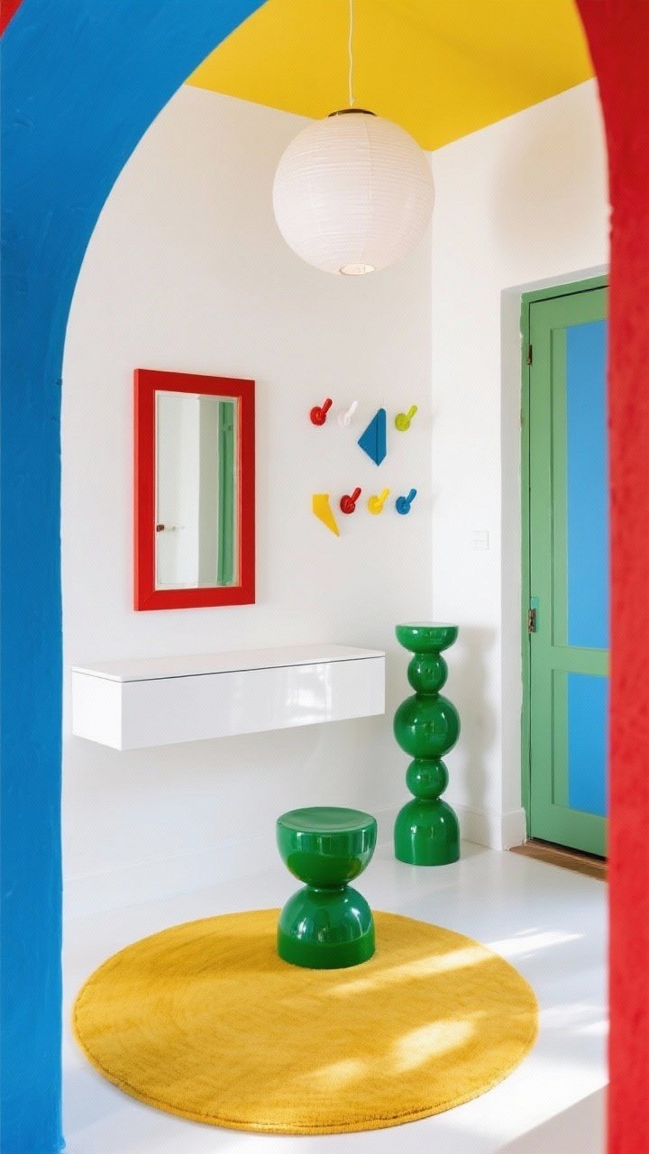 Console laquée blanche, miroir rectangulaire à bord rouge tomate, et crochets géométriques multicolores. Une suspension globe opale garde une base neutre, tandis qu’un tabouret totem en bois laqué vert donne un point focal dynamique.