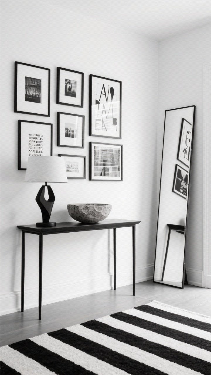 Une console noire mate avec pieds fins accueille une lampe sculpture et un bol en pierre. Au sol, un tapis rayé noir/blanc ancre la zone. Un grand miroir rectangulaire posé au sol agrandit l’espace sans en faire trop.