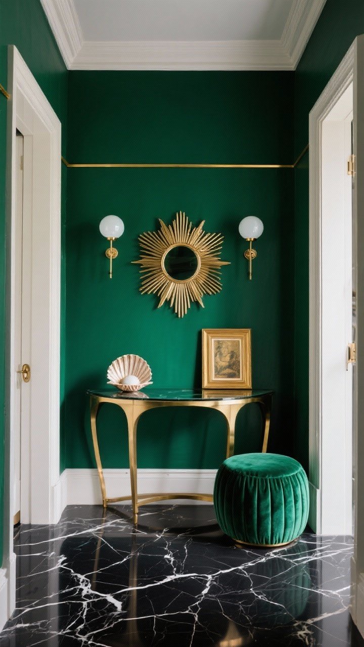Si tu veux faire un effet “wow”, opte pour des murs vert émeraude profond et une cimaise dorée fine. Le sol en marbre (ou grès imitation) noir avec veines blanches donne instantanément du standing.