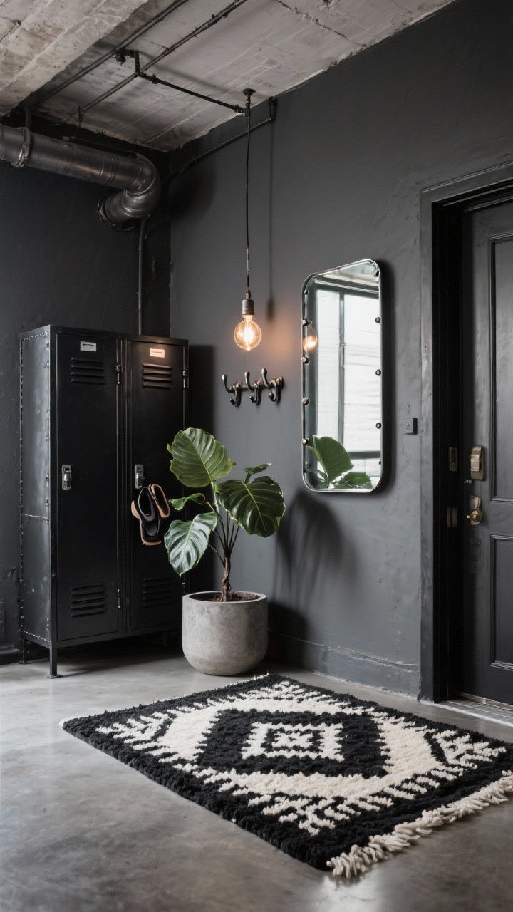 Tu aimes le caractère ? Peins les murs en gris anthracite et pose un sol en béton ciré avec finition satinée. Une armoire casier en métal noir pour les chaussures donne tout de suite le ton.