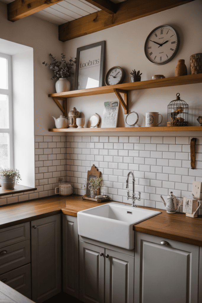 Le style rustique aime montrer ce qui est beau et utile. Troquez les placards hauts fermés pour des étagères ouvertes en bois brut. C’est l’occasion d’exposer votre plus belle vaisselle, vos bocaux en verre et vos ustensiles patinés.Cet agencement aère l’espace visuellement et rend la cuisine plus vivante. L’art de la table devient décor : une pile d’assiettes en céramique, des bols en bois ou des pots à épices ajoutent de la texture et de la personnalité. C’est une invitation à une cuisine décomplexée où tout est à portée de main.