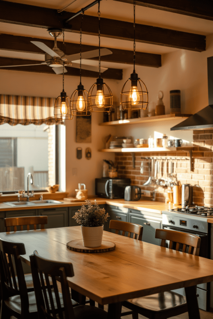 L’éclairage ne sert pas qu’à voir ; il sculpte l’ambiance. Dans une cuisine rustique, les luminaires sont des accessoires déco à part entière. Misez sur des matériaux bruts : suspensions en métal vieilli, lampes en cuivre, bois flotté ou ampoules à filament apparent.