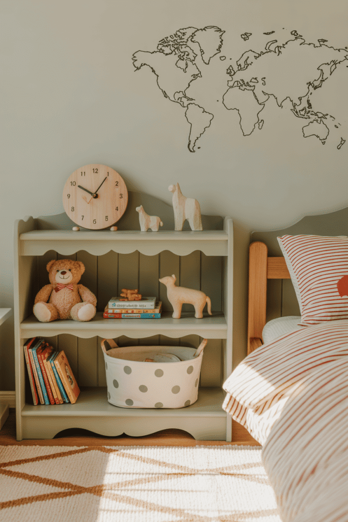 Le mélange parfait entre nostalgie et efficacité. Ce style est idéal pour un enfant qui apprécie les objets intemporels. Une base de tons neutres met en valeur des jouets rétro ou des illustrations classiques. La touche contemporaine ? Elle se trouve dans l’organisation : des rangements modernes et modulables qui permettent de garder ce trésor vintage parfaitement ordonné.