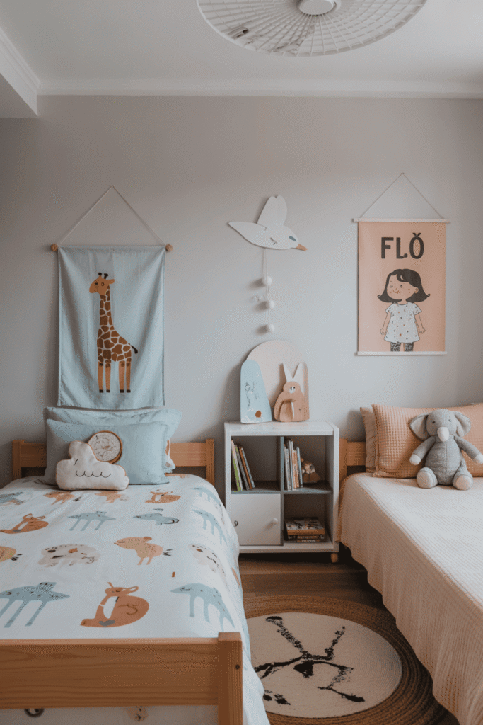 Le défi de la chambre partagée ? Garder du style tout en faisant plaisir à deux personnalités. Ici, l’élégance ludique est de mise grâce à une palette de couleurs douces et neutres qui apaise l’espace. L’astuce réside dans la personnalisation : des peluches spécifiques et des décorations murales au-dessus de chaque lit permettent à chaque enfant de revendiquer son petit coin douillet, tout en maintenant une harmonie visuelle globale.