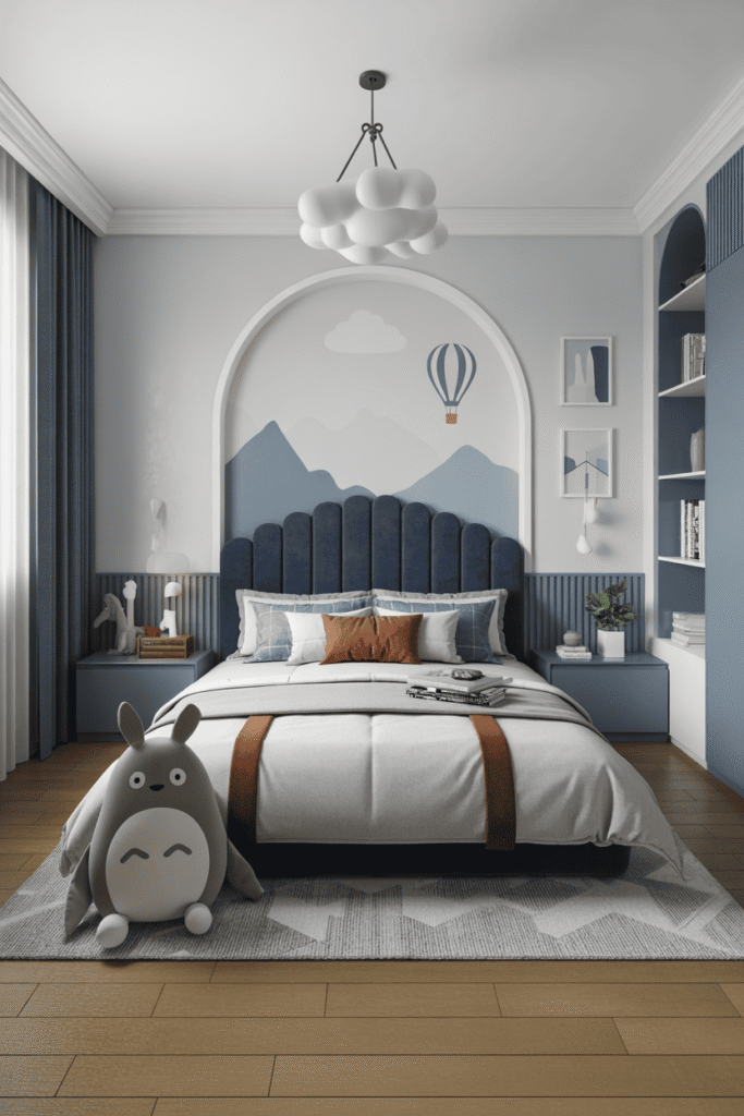 Envoyez votre enfant au septième ciel avec ce thème dédié à l’exploration. Une fresque murale panoramique représentant des montagnes, des montgolfières et des dirigeables devient la pièce maîtresse du décor. Parfait pour une chambre de garçon moderne ou un espace mixte, ce design équilibre la fantaisie du voyage avec le calme des teintes bleutées. Une utilisation stratégique de l’espace qui prouve que l’aventure n’attend pas le nombre des mètres carrés.
