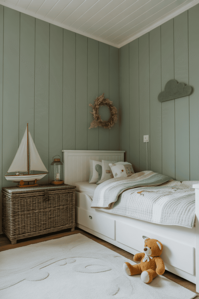 Oubliez le style marin cliché ; ici, on vise l’élégance du bord de mer. Ce design transporte l’esprit vers des rivages paisibles grâce à une palette sophistiquée de blancs et de beiges. Des paniers en osier naturel et une belle maquette de bateau suffisent à suggérer le thème. C’est une ode à la tranquillité, à la fois ancrée et imaginative, qui conviendra aussi bien à un tout-petit qu’à un enfant plus âgé rêvant d’océan.